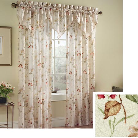 Price: $9.75 - $13.50 A multi-colored semi sheer floral print on crushed voile that will brighten any room in your home.**Pictured: 2 Panels and 3 Valances in Multi/Cream. - Ascot valance with tassel