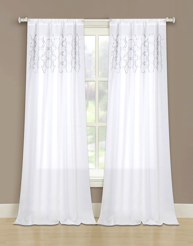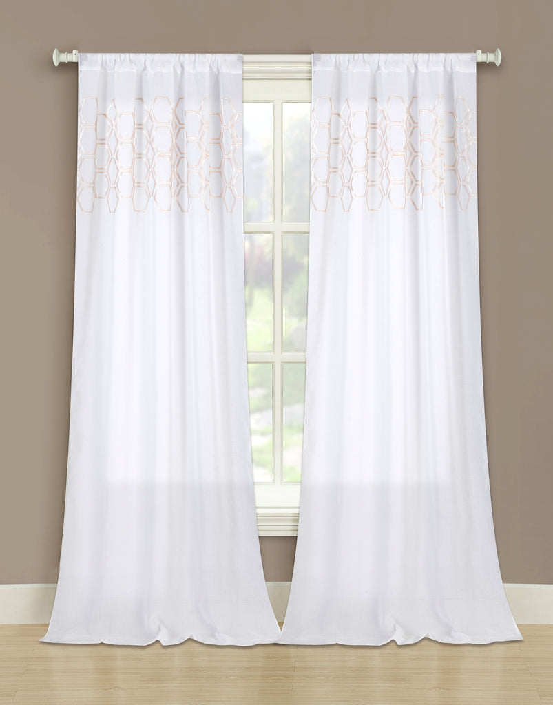 Honeycomb is a sheer panel with a shiny embroidered geo design across the top that will give your room a contemporary updated look. **Pictured: Honeycomb in Ivory/Gold and White/Silver